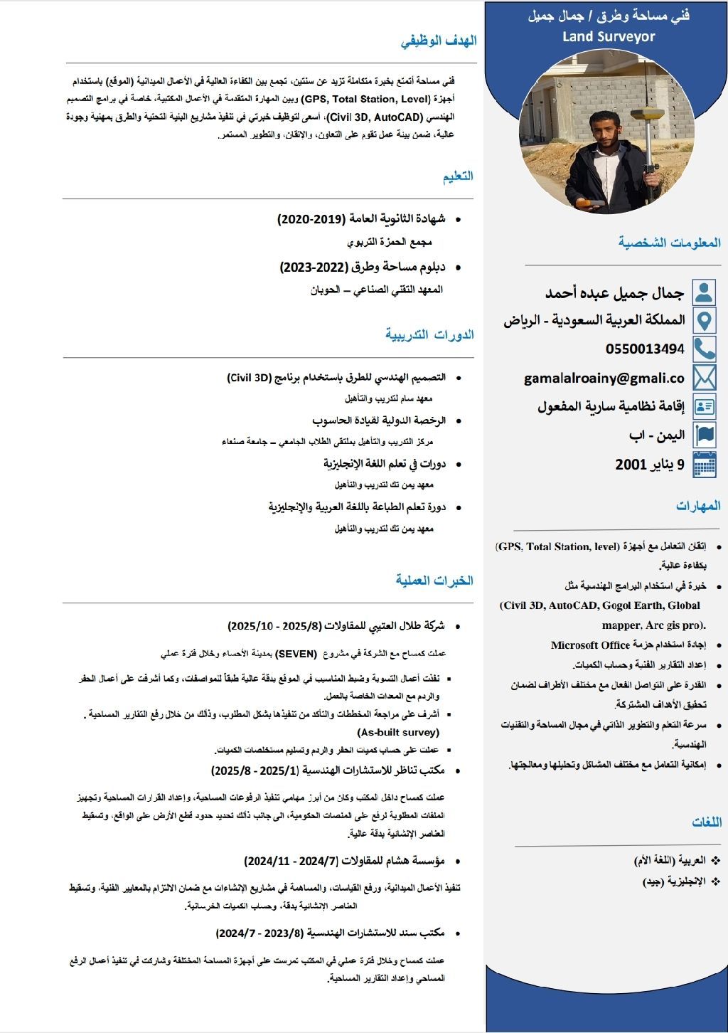 مساح أتمتع بخبرة متكاملة تزيد عن سنتين، تجمع بين الكفاءة العالية في الأعمال الميدانية (الموقع) باستخدام اجهزة (GPS, Total Station, Level) وبين المهارة المتقدمة في الأعمال المكتبية، خاصة في برامج التصميم الهندسي (Civil 3D, AutoCAD) أسعى لتوظيف خبرتي في تنفيذ مشاريع البنية التحتية والطرق بمهنية وجودة عالية، ضمن بيئة عمل تقوم على التعاون، والاتقان، والتطوير المستمر
