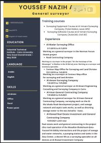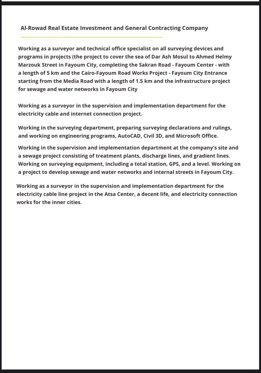 يوسف مساح عام خبرة 6 سنين طرق وانشاءات وصرف وكباري وبنية تحتية ومعيا شهادة سلامه مهينه وأخذ دوره كاملة شغال علي جميع اجهزة المساحة توتال - ميزان - جيبي أس ومكتب فني اوتوكاد وسيفل ثري دي تلفون