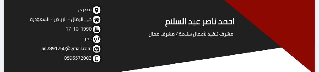 الاسم أحمد ناصر عبد السلام العمر 35 سنة الموقع الرياض - حي الرمال الإقامة سارية وقابلة للنقل الرخصة رخصة قيادة سعودية سارية الخبرات العملية 1 - أكثر من 3 سنوات في شركة الحمد للمقاولات - مصر بوظيفة مشرف عمال. 2 - أكثر من سنة في شركة السعد لأعمال السلامة - السعودية، 3 - أكثر من سنة ونصف في شركة تقنية الانذار للأمن والسلامة - السعودية