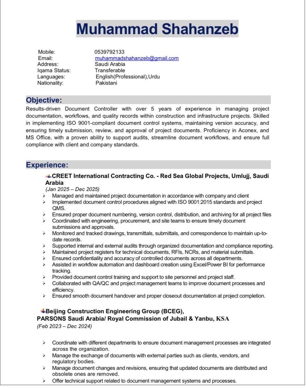 Qualified Document Controller with 5 + years’ experience in construction projects across Saudi Arabia. Skilled in managing IRs, MIRs, NCRs, RFIs, submittals, drawings, ITPs, reports, OM manuals, and vendor coordination. Strong expertise in compliance, audit readiness, and workflow management. Based in Jubail with transferable Iqama, ready to join immediately anywhere in KSA