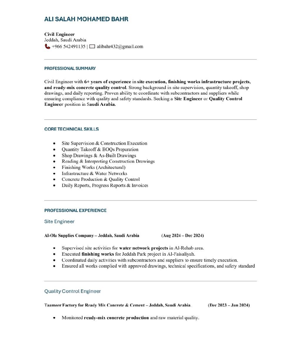QA/ QC Civil Engineer With 6 years of experience in concrete works, finishing works, and concrete batching plants. Certified by the Saudi Council of Engineers (SCE) Currently based in Jeddah - Transfer of sponsorship available - Ready to join immediately. Available to work in all regions of the Kingdom of Saudi Arabia