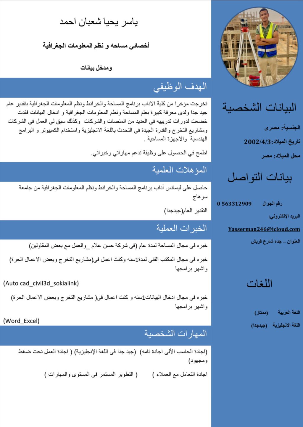 خريج ليسانس أداب قسم المساحة والخرائط ونظم المعلومات الجغرافية لدى خبرة عملية في أعمال المساحة ع اجهزة Total station وجهاز الميزان ونظم المعلومات الجغرافيه وادخال البيانات بدقة عملت في شركات ومشروعات متنوعه واستخدمت اجهزة المساحة وبرامج AutoCAD - civil 3d - sokialink وبرامج ادخال البيانات word - Excel. أتميز بالالتزام وتحمل ضغط العمل وأسعى للحصول على فرصة عمل أطور من خلالها مهارتي وأضيف قيمة حقيقية