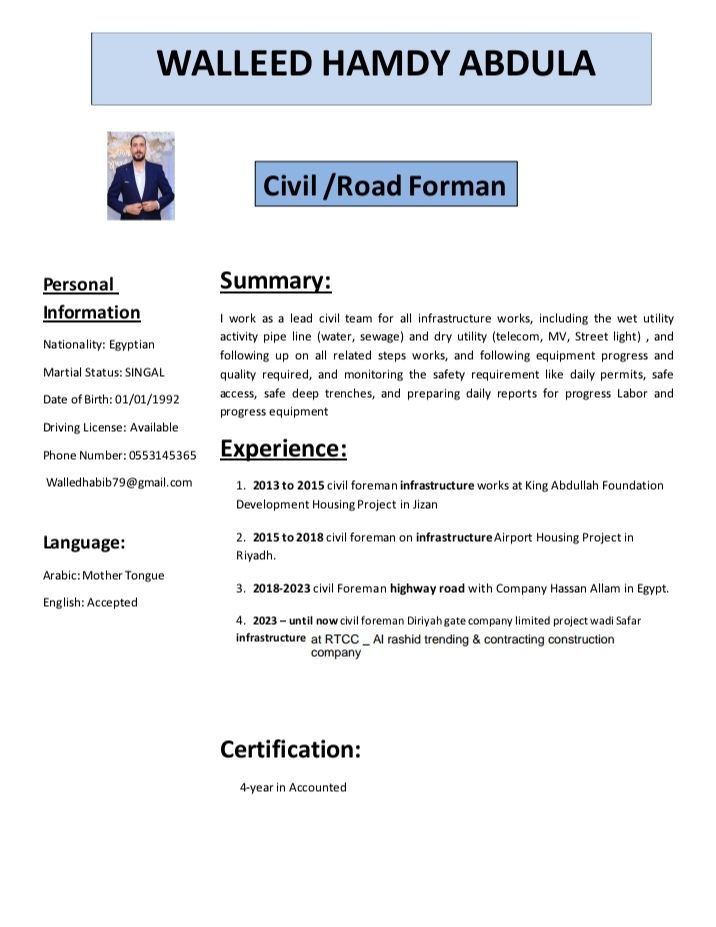 أنا مراقب مدني طرق وبنية تحتية لاند سكيب وخطوط المياه خبرة في مجال المقاولات أكثر من 15 سنوات ابحث عن عمل ونقل كفالة مراقب مدني أقامه سارية رخصة سارية جاهز لنقل الكفالة والعمل في أي وقت آخر مشروع بوابة الدرعية وادي صفار في الرياض