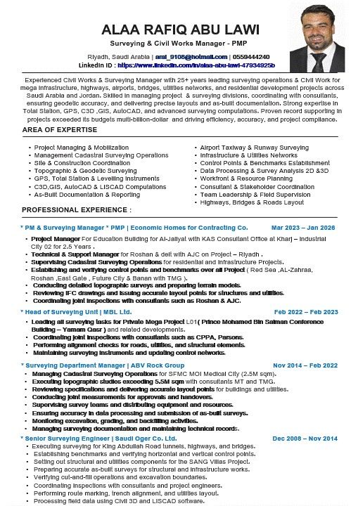 Expert Civil & Surveying field works manager overseeing construction projects with + 25 years, 22 years experience inside Saudi Arabia Looking for job opportunity and can join the work place directly with valid & transferable Iqama