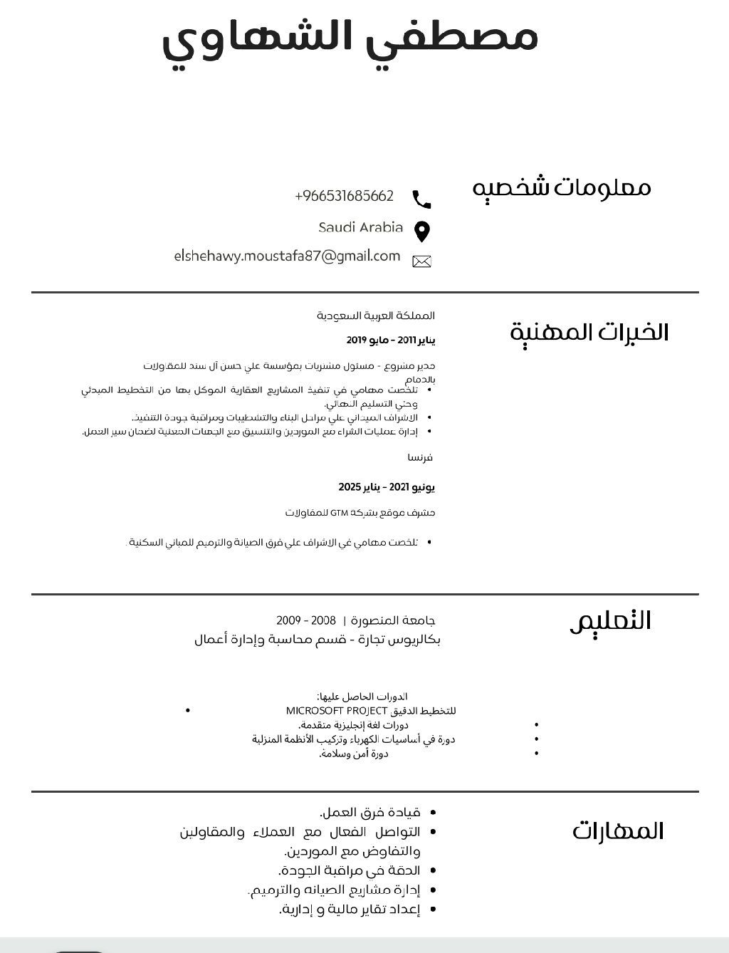 خبرة بالعمل في مملكة من 2011 الى 2019 كمدير مشروع ومدير مشتريات ب مؤسسة حسن آل سند في الدمام والاشراف علي تنفيذ المشاريع العقاريه من التخطيط المبدئي وحتى التسليم النهائي من مراحل البناء والاشراف والتشطيب ومراقبة جودة التنفيذ. ومن 2020 وحتى 2025 مشرف موقع بشركة GTM لمقاولات في فرنسا وتلخصت مهامي في الاشراف علي الصيانة والترميم للمباني السكنية