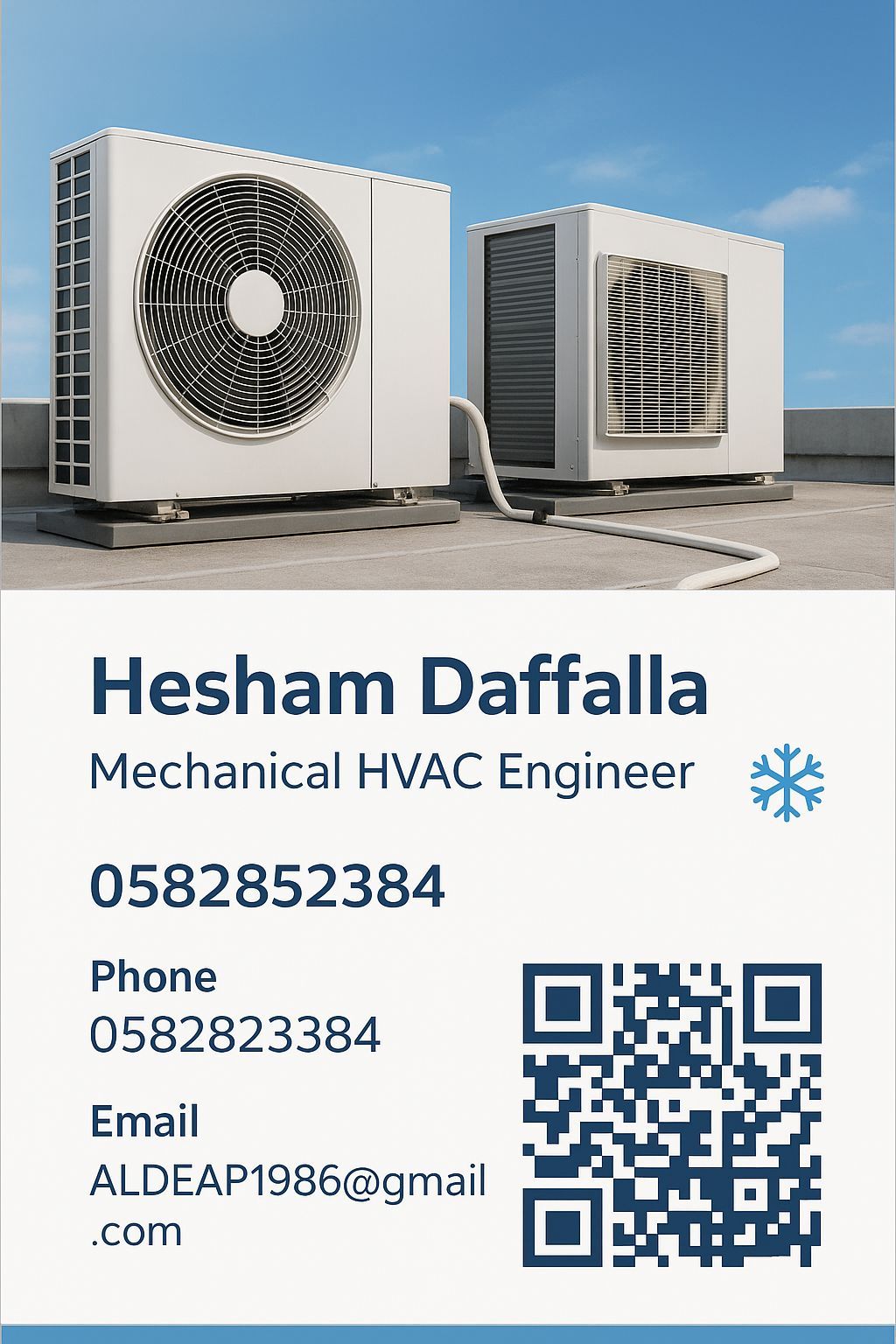 مهندس ميكانيكي سوداني الجنسية حاصل على درجة الماجستير في هندسة التكييف والتبريد، بخبرة 15 عاما في تصميم وتركيب واختبار وتشغيل وصيانة أنظمة التدفئة والتهوية وتكييف الهواء. خدماتنا 1. دراسة الأحمال الحرارية للمشروع واعداد المخططات واختيار نظام التكييف الذي يناسب المشروعات السكنية والتجارية. 2. تنفيذ الأعمال (تأسيس الصرف والنحاس، توريد وتركيب اجهزة التكييف والتبريد، التشغيل والاختبار، الصيانة)