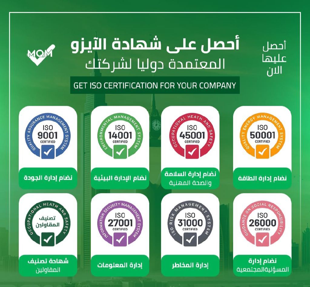 خلي شركتك تتألق وتتميز مع صناع الجودة الحديثة، نسهل عليك الحصول على شهادات الأيزو العالمية بسرعة واحترافية. ليش تختارنا تأهيل رسمي ومعتمد فريق خبراء جاهز لدعمك رحلة سهلة وسريعة نحو التميز خليك دائما خطوة قدام في السوق الجودة العالمية