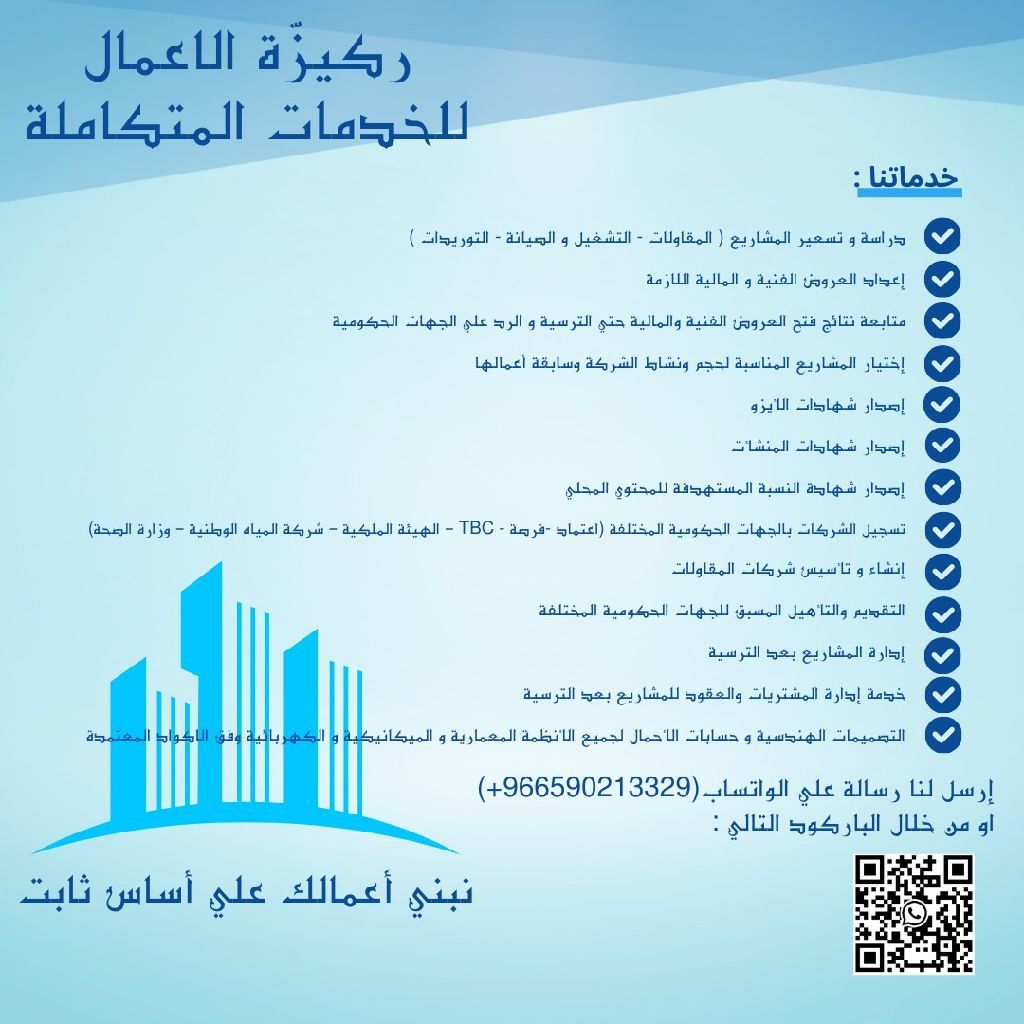 هل تسعير مشروعك مبني على أرقام حقيقية في ركيزة الأعمال للخدمات المتكاملة نساعدك تبدأ مشروعك على أساس صحيح. نقدم دراسة وتسعير احترافي للمشاريع اعداد العروض الفنية والمالية تسجيل وتأهيل الشركات بالجهات الحكومية إدارة المشاريع بعد الترسية نختصر عليك الوقت ونقلل المخاطر ونرفع فرص الترسية تواصل معنا اليوم وخذ قرارك بثقة