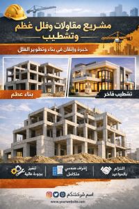 نوفر لكم تنفيذ جميع أعمال العظم - صب قواعد وسقف - أعمدة وأسقف - بناء ملاحق واستراحات - تنفيذ فلل وعمارات كاملة أعمال التشطيبات - لياسة ودهانات - تركيب سيراميك وبورسلان - جبسون بورد وديكورات - سباكة وكهرباء - تشطيب فلل وشقق تسليم مفتاح التزام بالمواعيد اشراف هندسي جودة في التنفيذ أسعار منافسة