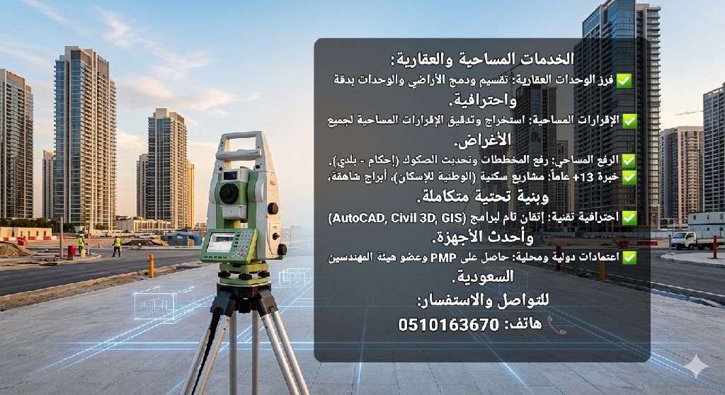 مساح عام وحاسب كميات (Chief Surveyor) خبرة تزيد عن 13 عاما من الخبرة في تنفيذ والاشراف علي مشاريع سكنية تابع لهيئة الوطنية لاسكان بالاضافة وتنفيذ الأبراج العالية بالاضافة مشاريع البنية التحتية بما في ذلك شبكات الطرق وشبكات المياه والصرف الصحي وشبكات الكهرباء وشبكات الري وتصريف مياه الأمطار. بارع في استخدام اجهزة والبرامج المساحية المتقدمة، مما يضمن الدقة والكفاءة في تنفيذ المشاريع. الرياض