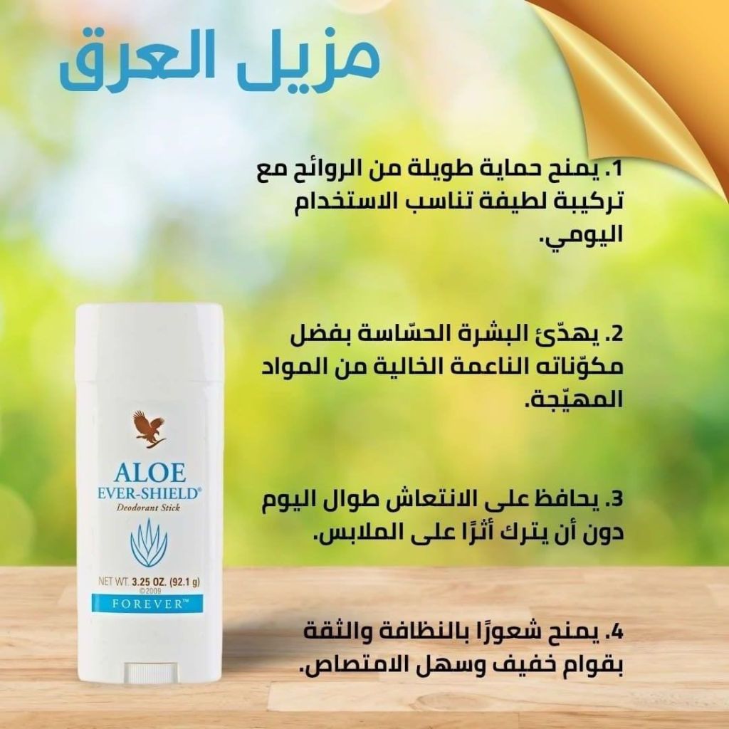 ألوا ايفر شيلد (مزيل العرق بالصبار) المزايا يعطي إحساس بالانتعاش والثقة حتى في أقصى درجات الحرارة والضغط. يعمل على تبييض منطقة تحت الا بط مع الاستخدام المستمر لاحتوائه على جل الصبار ومواد طبيعية لتفتيح لون البشرة. لطيف للغاية على البشرة. ذو رائحة نظيفة ومنعشة ولكنها ليست قوية الى حد يدعو الى النفور. لا يترك بقعا على الملابس. خال من أملاح الألومينيوم المضادة للتعرق الضارة
