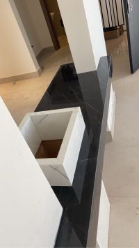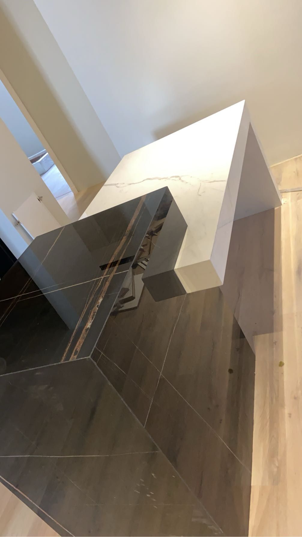 معلم تركيب بورسلان ألواح كبيرة تفصيل كاونترات مغاسل شطف زاوية 45 تركيب جدران