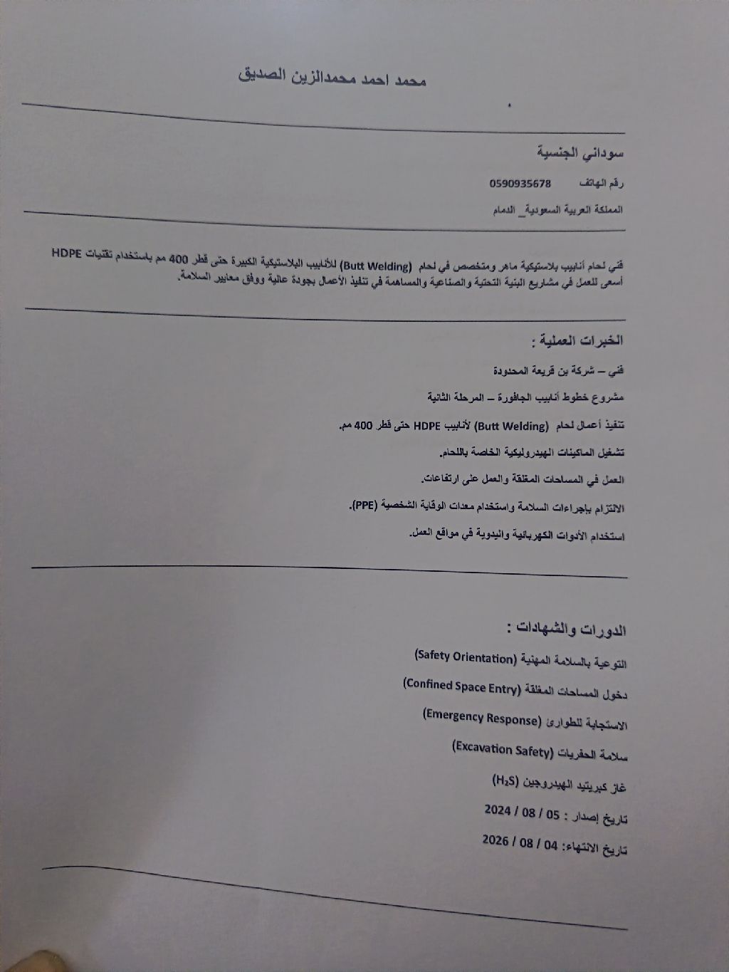 فني لحام أنابيب ماهر ومتخصص (Butt WELDING) للأنابيب البلاستيكية الكبيرة حتى قطر 400م باستخدام تقنيات HDPE أسعى للعمل في مشاريع البنيه التحتية والصناعية المساهمه في تنفيذ الأعمال بجودة عالية ووفق معايير السلامة