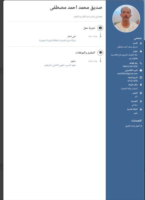 فني لحام - ابحث عن عمل في مكة المكرمة فني لحام محترف ابحث عن فرصة عمل داخل مكة المكرمة. لدي خبرة عملية لا تقل عن 4 سنوات في مجال اللحام، مع القدرة على العمل بدقة وتحمل ضغط العمل والالتزام في السلامة. المهارات لحام خبرة لسنوات العمل ضمن فريق الالتزام بالمواعيد والجودة عايز نقل كفالة. جاهز للعمل فورا، وابحث عن بيئة عمل مستقرة ومحترمة