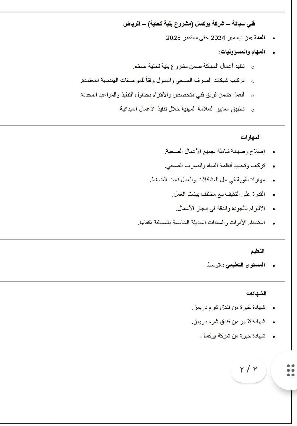 Plumber (Maintenance & Infrastructure) Nationality Egyptian Experience 7 Years Professional Summary Experienced plumber with 7 years of hands - on expertise in sanitary works and infrastructure systems. Proven ability to handle maintenance, water supply, drainage systems, and swimming pool services. Skilled in working under pressure, troubleshooting plumbing issues, and delivering quality workma