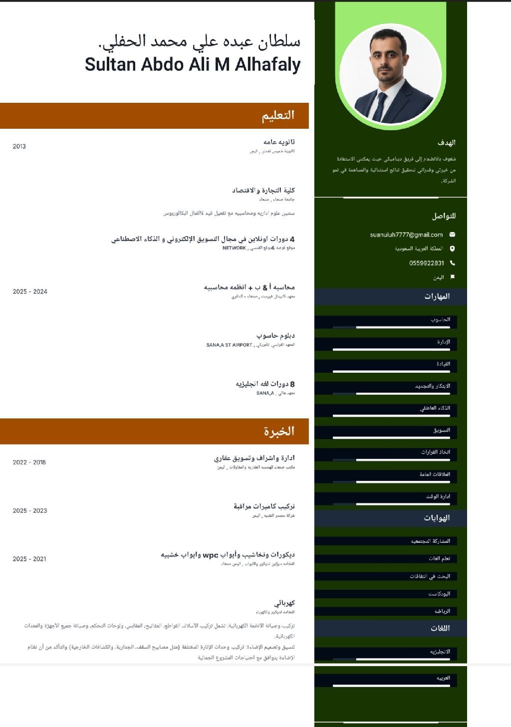 معلم ديكور ونجاره وكهرباء مهارة في الحاسوب وامتلك خبرة في الأنظمة المحاسبية خبرة في تركيب كاميرات المراقبة أجيد قيادة السيارة عادي وأوتوماتيك خبرة في التسويق