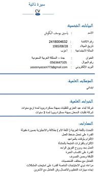 I am Yasin bin Yusuf Al - Bakoush. Nationality Tunisian residing in Saudi Arabia I am looking for a job my profession is poohia and plumbering and I have 7 years of experience in the Kingdom of Saudi Arabia and I have no problem working anything and the CV is in the picture