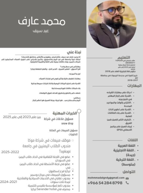 الاسم محمد عارف عبد سيف المسمى الوظيفي خدمة عملاء المؤهل بكالوريوس إدارة الأعمال الدولية - جامعة Topkapi (تركيا) الخبرة أكثر من 3 سنوات في خدمة العملاء والمبيعات والعلاقات العامة المهارات مهارة عالية في التواصل وحل مشكلات العملاء التفاوض والاقناع واغلاق الصفقات القدرة على التحليل واتخاذ القرارات بناء علاقات قوية ومستدامة مع العملاء الالتزام والقدرة على انجاز المهام أجد الغه الانجليزية والتركيه