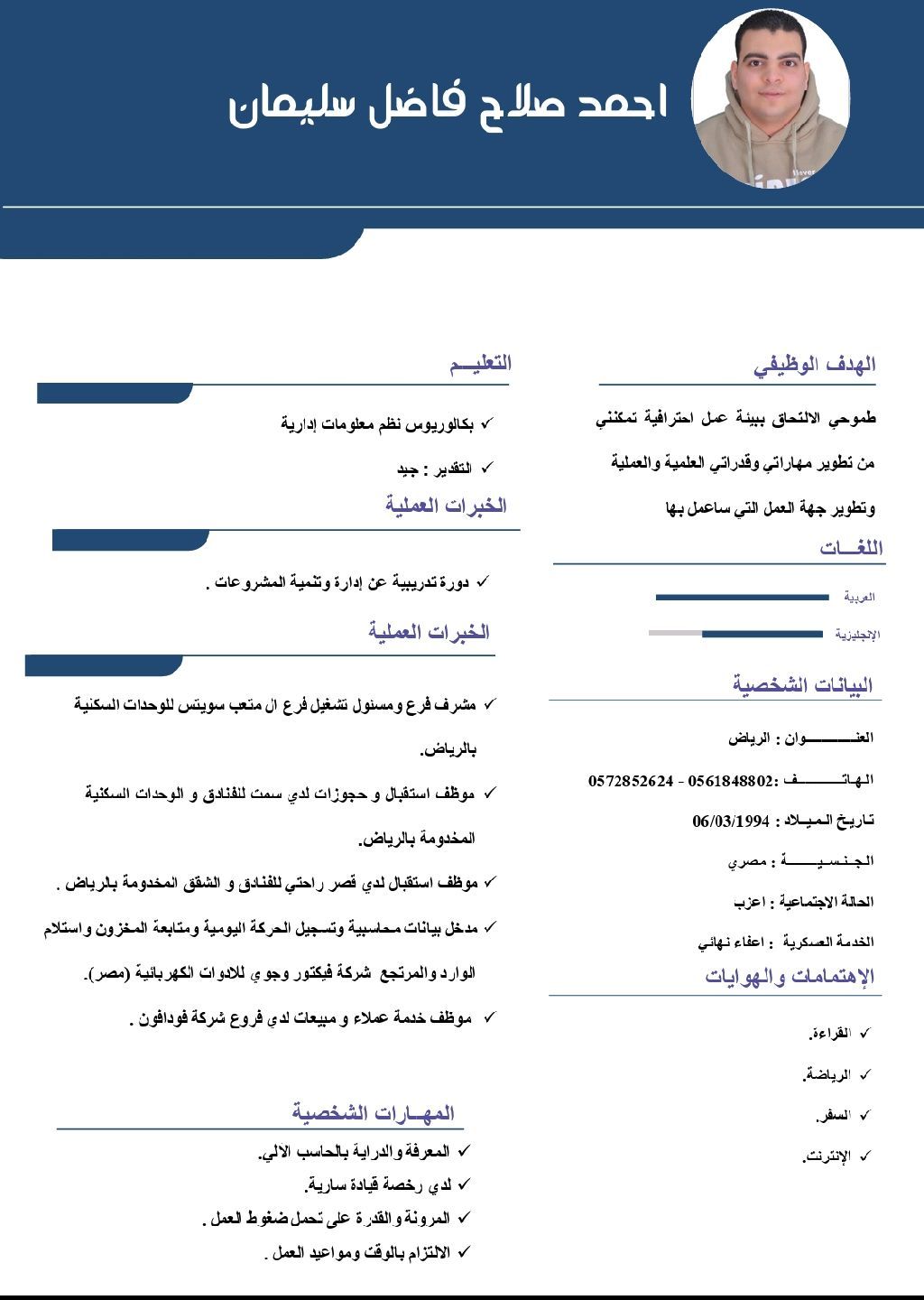 مصري الجنسية مقيم في الرياض ابحث عن عمل موظف استقبال ومشرف فنادق العمل على نزيل باصداراته وبوكينج وزائر ومتابعة واهتمام زيادة أب تقييمات الايجابية للعملاء على جوجل ما بس وبوكينج والعمل على برامج فريشا وجيلاميرا خبرة عملية بالمملكة ثلاث سنوت ونصف وجيد جدا على برامج مايكروسوفت أوفيس ودقة متناهية وسرعة في ادخال البيانات إقامة سارية ورخصة قيادة سارية وشهادة صحية من التثقيف الصحي في الرياض