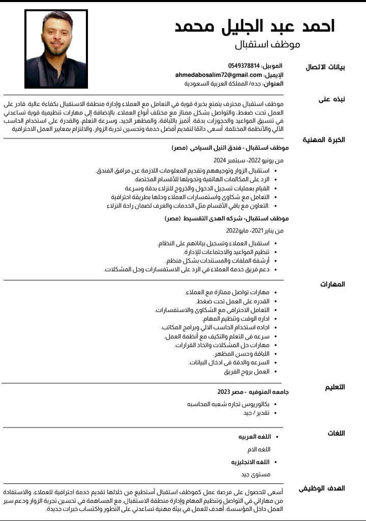 موظف استقبال محترف يتمتع بخبرة قوية في التعامل مع العملاء وإدارة منطقة الاستقبال بكفاءة عالية. قادر على العمل تحت ضغط، والتواصل بشكل ممتاز مع مختلف أنواع العملاء، بالاضافة الى مهارات تنظيمية قوية تساعدني في تنسيق المواعيد والحجوزات بدقة. أتميز باللباقة، والمظهر الجيد، وسرعة التعلم، والقدرة على استخدام الحاسب الآلي والأنظمة المختلفة. أسعى دائما لتقديم أفضل خدمة وتحسين تجربة الزوار، والالتزام بمعي