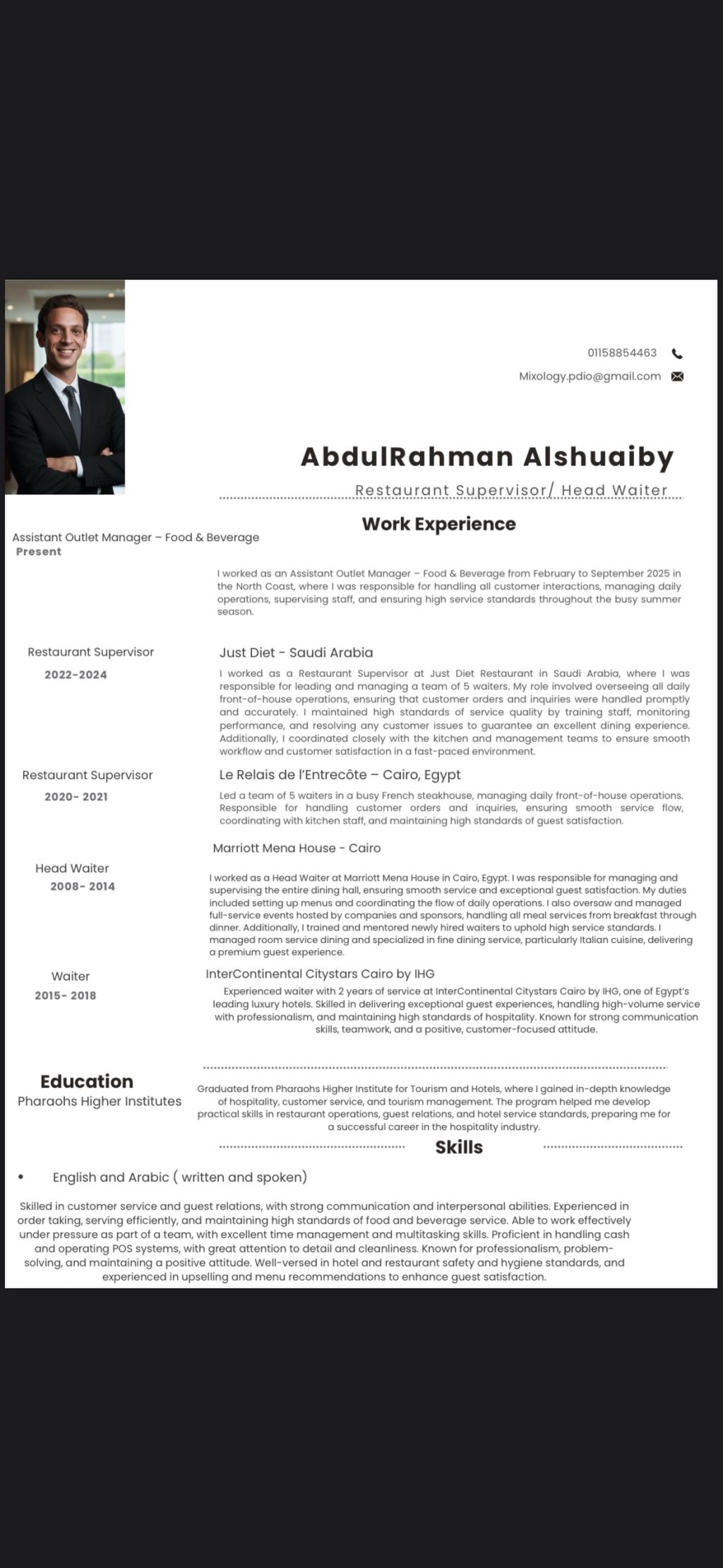 مشرف مطاعم محترف يتمتع بخبرة تزيد عن 10 سنوات في قيادة العمليات والاشراف على فرق الخدمة في بيئات ضيافة راقية. لدي سجل حافل في الإدارة الفعالة لعمليات الواجهة الأمامية (Front - of - House) وضمان تحقيق أعلى معايير الخدمة ورضا الضيوف