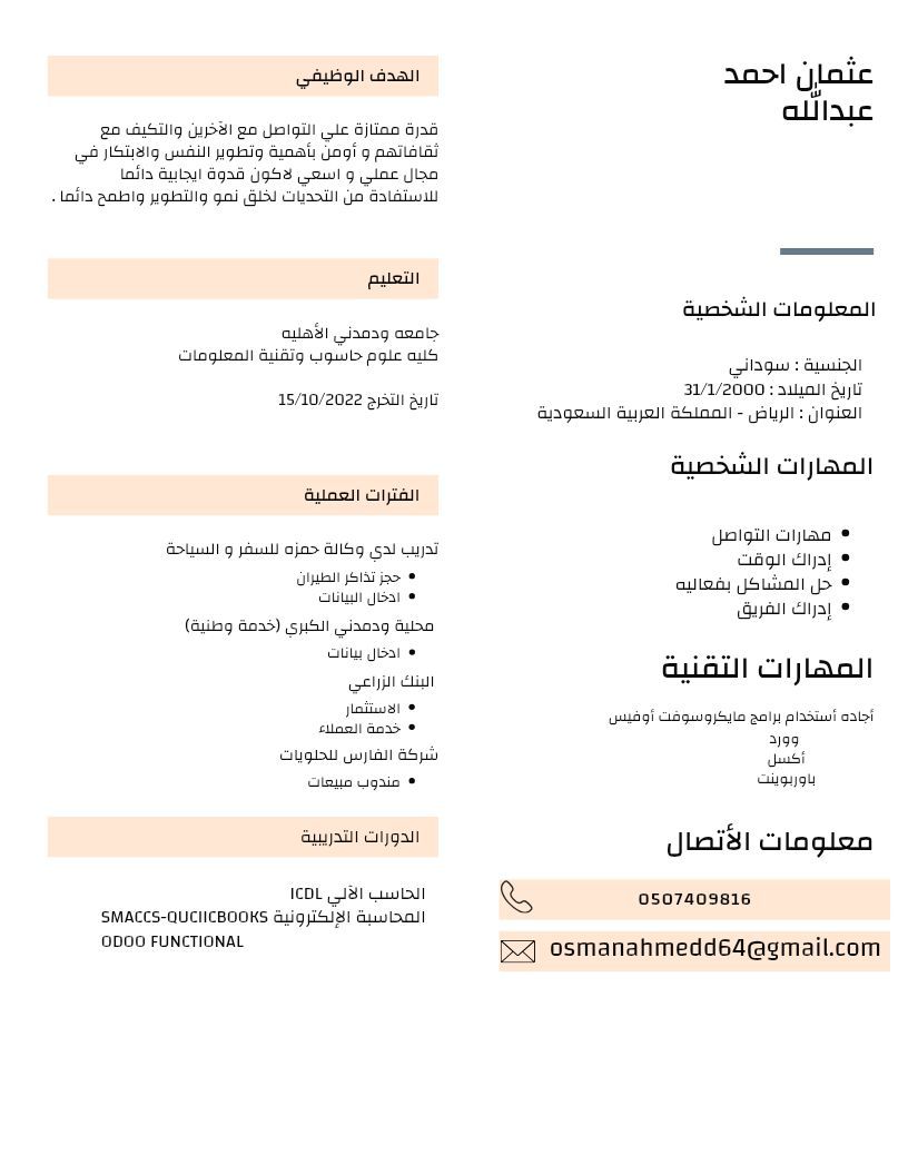 سوداني مقيم ب الرياض حاليا اعمل مندوب لدي stc Bank خريج بكالوريوس علوم حاسوب ابحث عن عمل أي مجال وليس لدي مشكلة أتعلم أشياء جديدة وأكون جزء من نجاح الشركة عملت تدريب لدي البنك الزراعي وعملت لدي محلية مدني الكبري وعملت لدي وكالة سفر وسياحة ولدي كورسات حاسب الى ومحاسبة الالكترونية وodoo functional