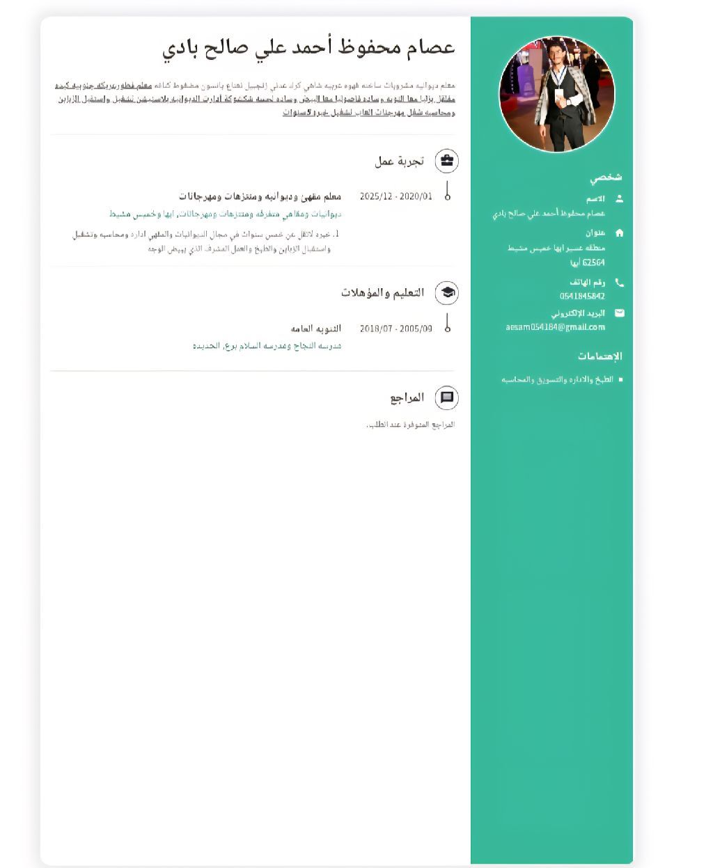 معلم ديوانية مشروبات ساخنه قهوة عربية شاهي كرك عدني زنجبيل نعناع يانسون مضغوط كنافة معلم فطور عريكة جنوبيه كبدة مقلقل بزاليا معا التونه وسادة فاصوليا معا البيض وسادة لحسه شكشوكة أدارت الديوانية بلايستيشن تشغيل وأستقبل الزبائن ومحاسبه شغل مهرجانات منتزهات ألعاب تشغيل خبرة 5 سنوات
