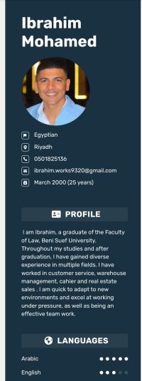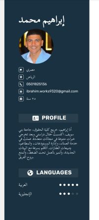 إبراهيم حاصل علي ليسانس حقوق مقيم منذ سنة ونصف في السعودية ومعي إقامة سارية لمدة سنة ابحث عن عمل أمين مستودع / كاشير / خدمة عملاء / سيلز