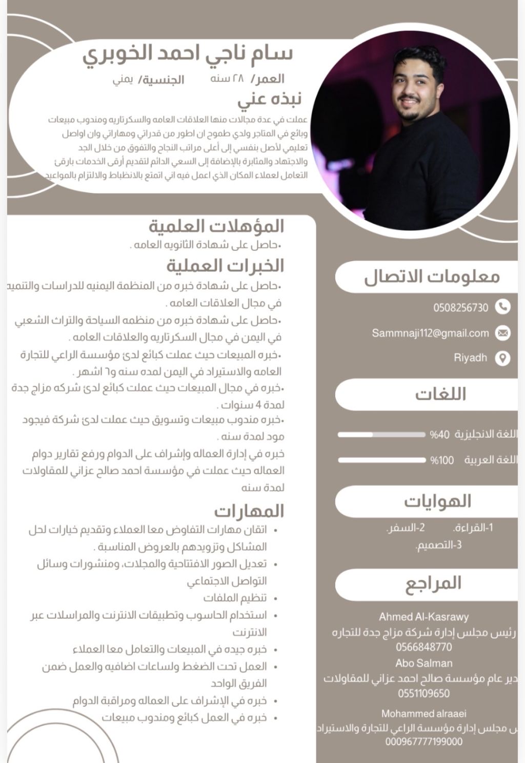 سام يمني الجنسية خبرة في المبيعات حيث عملت في شركة مزاج جدة كبائع لمدة أربع سنوات. ومدير مبيعات لمدة سنة في شركة روز مود. ومندوب مبيعات في شركة فيجود مود لمدة سنة ومراقب دوام ومدخل بيانات في مؤسسة مقاولات لمدة سنة رخصة سارية اقامتي منتهية بسبب تعثر صاحب العمل الى اشتغل معه ولا زلت على رأس العمل لتفاصيل أكثر التواصل ع واتساب وتم ارفاق السي في في صورة
