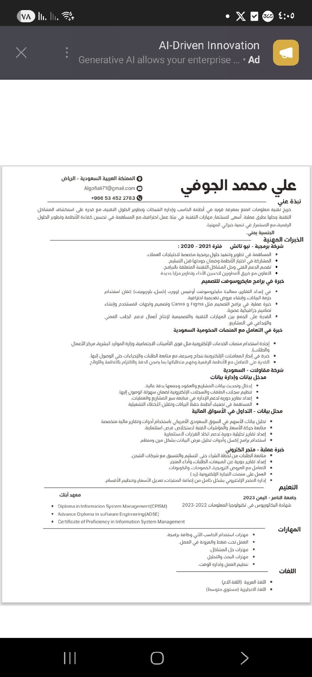 لدي خبرة في إدارة المتاجر الالكترونية والكاشير وادخال البيانات في شركة مقاولات، أحمل بكالوريوس تقنية المعلومات، وأجيد استخدام الحاسب والأنظمة الالكترونية، مع رخصة قيادة وإقامة سارية