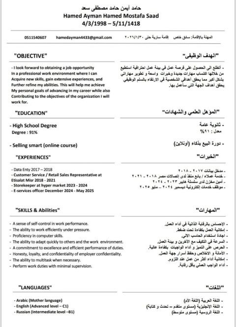 أنا شاب طموح وملتزم، امتلك مستوى ممتاز في اللغة الانجليزية وخبرة قوية في خدمة العملاء والتعامل مع مختلف أنواع العملاء باحترافية ولباقة. عندي مهارات ممتازة في الحاسب الآلي واستخدام البرامج الأساسية والمتخصصة، بالاضافة الى القدرة على حل المشكلات التقنية بسرعة وكفاءة. حاصل علي بكالوريوس هندسة قسم ملاحة جوية وتكنولوجيا، أتميز بمهارات تواصل عالية باللغة الانجليزية والصبر في التعامل مع المواقف الصعبة