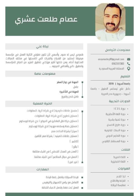 I am Essam Talaat Ashry, 29 years old, Bachelor of Law, residing in Saudi Arabia, able to withstand circumstances and deal with all circumstances and cooperate with the team and all classes that can be dealt with at work as it is, and I worked in many fields of contracting companies in Egypt such as Orascom Contracting Company and Al - Rowad Contracting Company. I worked as a traffic officer, a se