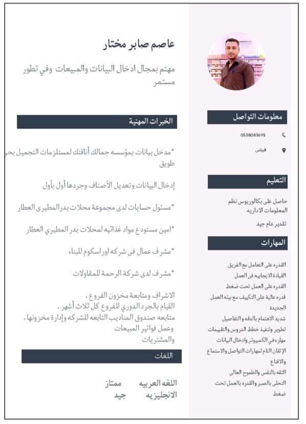 عاصم صابر مختار إبراهيم - 25 سنة - مصري بكالوريوس نظم المعلومات الاداريه خبرة في ادخال البيانات والكاشير ومشرف عمال وخبرة في المبيعات والتسويق