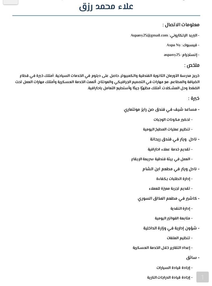 خريج سياحة وفنادق قسم خدمات سياحة وعندي خبرة في الكاشير وبالأخص مجال المطاعم وعندي مهارة استخدام الكمبيوتر والانترنت وسريع التعلم والتعامل مع الفريق جيدا وامتلك مهارة التصوير والمونتاج وامتلك خط ممتاز وسبق لي وان عملت في الشؤون الادارية خبرة سنتين مستعد للعمل فورا