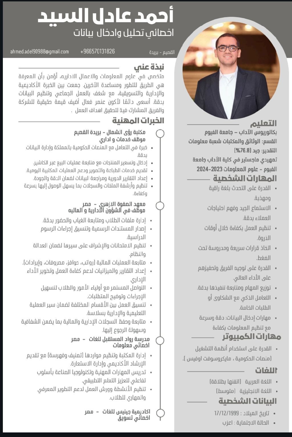 أنا موظف استقبال أرغب في العمل معي إقامة سارية لمدة عام وقابلة للنقل. خبرة في التعامل مع الحاسب الآلي وبرامج Microsoft Office (Word - Excel - PowerPoint) وأتميز ب السرعة والدقة في ادخال وتنظيم البيانات. أستطيع العمل تحت الضغط، والالتزام بالمواعيد النهائية، والعمل ضمن فريق أو بشكل مستقل