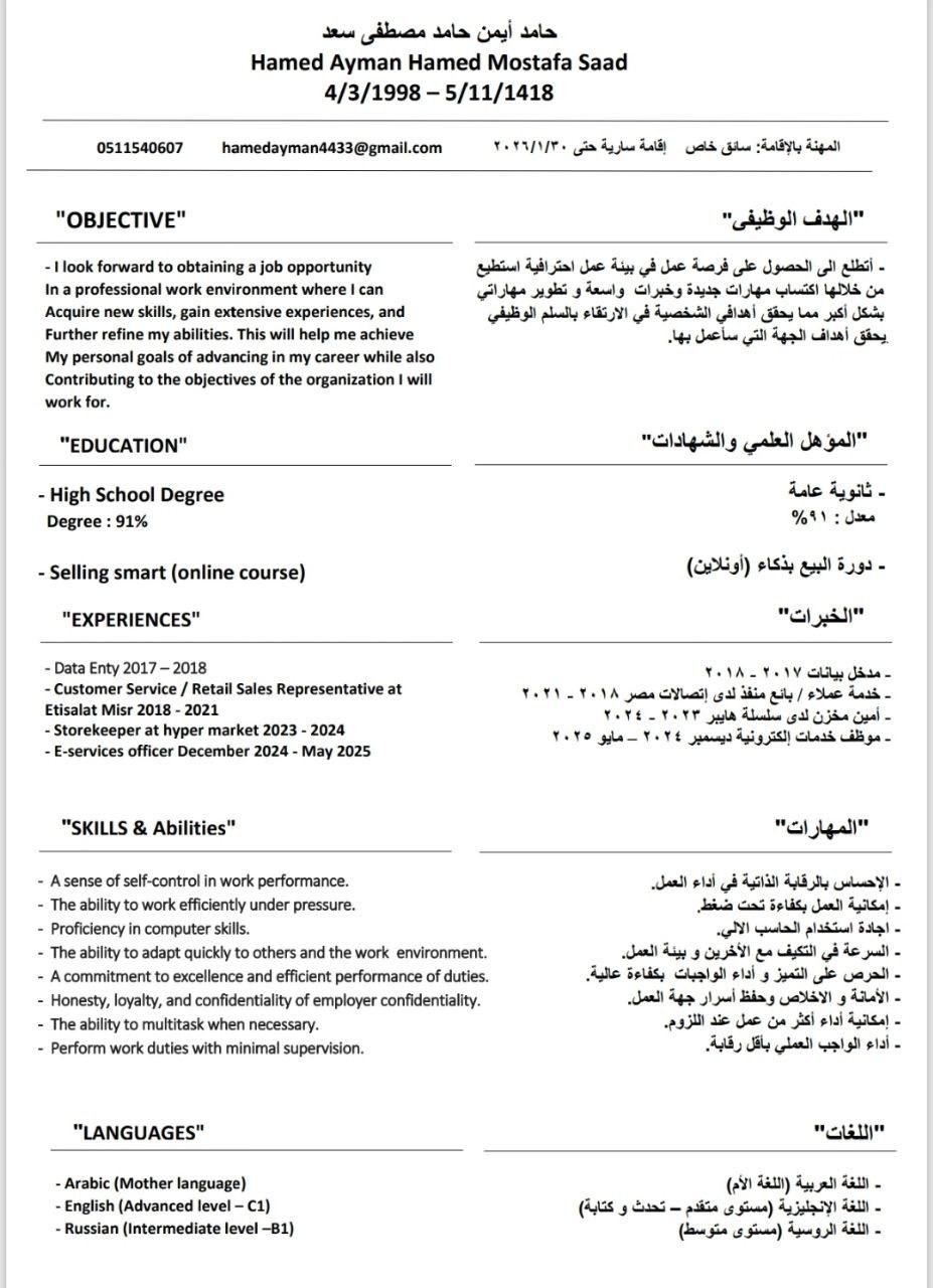 ابحث عن وظيفة في الاستقبال، المبيعات، خدمة العملاء، أو الخدمات العامة أو أي وظيفة مناسبة. لدي خبرة كبيرة في استخدام الحاسب الآلي، ومتمكن من التحدث باللغة الانجليزية. ملتزم، لبق، سريع التعلم، وجاهز ابدأ في العمل مباشرة