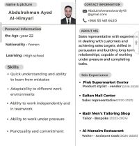 أنا شاب يمني ابحث عن عمل عمري 23 اسمي عبدالرحمن الحميري. ابحث عن عمل في أي مجال كان أنا مجالاتي كاشير شاورما فترة قصيره بياع مباشر في مراكز تجاريه، في سوبر ماركت اغذيه في مطاعم مباشر، مساعد معلم مقدم طعام أي شغله اعمل شاب وسيم وخلوق ومستعد اشتغل في أي عمل كان أنا معطل وموجود في الاحساء، لدي الشغف والطموح للعمل واجتهاد والتعلم أي عمل واي شغل كان، اقامتي سارية، عامل تحميل وتنزيل في الإقامة للتواصل