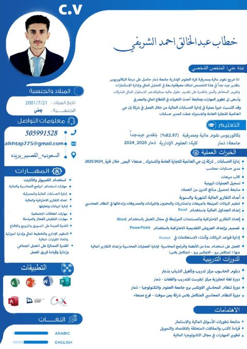 محاسب مالي ومدخل بيانات خبرة لمدة سنة عملت كمدير حسابات إدارة حسابات العملاء كاتب مبيعات تسجيل العمليات اليومية متابعة تحصيل مبالغ الديون من العملاء والعمل على استخدام عدة من الأنظمة والبرامج المحاسبية وقد اكتسبت خبرة عملية في إدارة الحسابات المالية أنا خريج كلية العلوم الادارية - تخصص العلوم المالية والمصرفية - جامعة ذمار حاصل على درجة البكالوريوس بتقدير جيد جدا في هذا التخصص