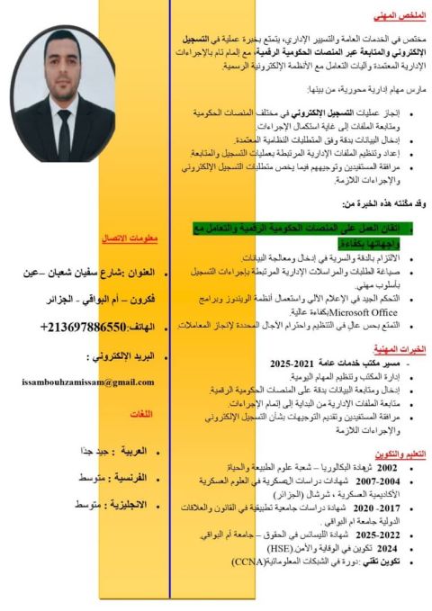مختص في الخدمات العامة والتسيير الاداري، يتمتع بخبرة عملية في التسجيل الالكتروني والمتابعة عبر المنصات الحكومية الرقمية، مع المام تام بالاجراءات الادارية المعتمدة وآليات التعامل مع الأنظمة الالكترونية الرسمية