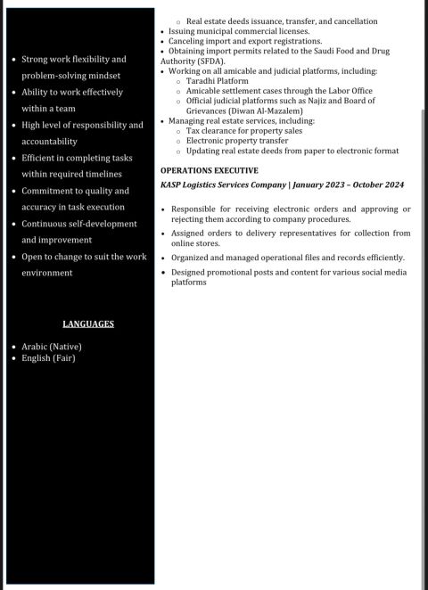 ابحث عن فرصة عمل في مجال ادخال البيانات، بخبرة عملية تمتد لسنتين لدى مكاتب الخدمات العامة، اكتسبت خلالها معرفة واسعة والماما شاملا باجراءات العمل. أجيد التعامل باحتراف مع جميع المنصات والمواقع الحكومية السعودية مثل ابشر، مقيم، قوى، التأمينات، ومنصات الجهات الرسمية الأخرى. أتميز بالدقة، سرعة الانجاز، وتحمل ضغط العمل، مع قدرة عالية على تنظيم البيانات وانجاز المهام بكفاءة مستعد للانتقال الى أي مكان
