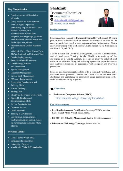 Experienced Document Controller with 3 + years of experience in construction projects in Saudi Arabia. Strong expertise in Oracle Aconex, document lifecycle management, submittals, transmittals, and coordination with clients, consultants, and contractors. Skilled in ensuring document accuracy, compliance, and timely approvals. Available with transferable visa