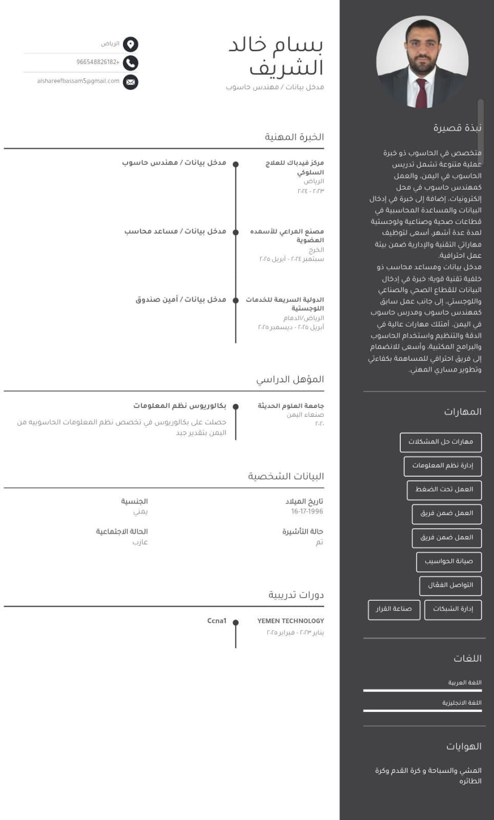 محاسب ومدخل بيانات وامتلك خبرة في ادخال البيانات ومطابقة الحسابات مدة عامين في المملكة ولدي اقامة سارية