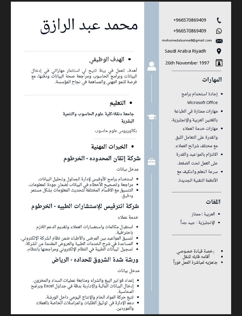 ابحث عن فرصة عمل في مجال مدخل بيانات أو كاشير، حيث امتلك خبرة جيدة في استخدام الحاسب الآلي وبرامج Microsoft Office، مع القدرة على ادخال البيانات بدقة وسرعة، وإدارة العمليات الحسابية والمبيعات بكفاءة. أتميز ب حسن التعامل مع العملاء، والعمل بروح الفريق، والالتزام بالمسؤولية والدقة في أداء المهام