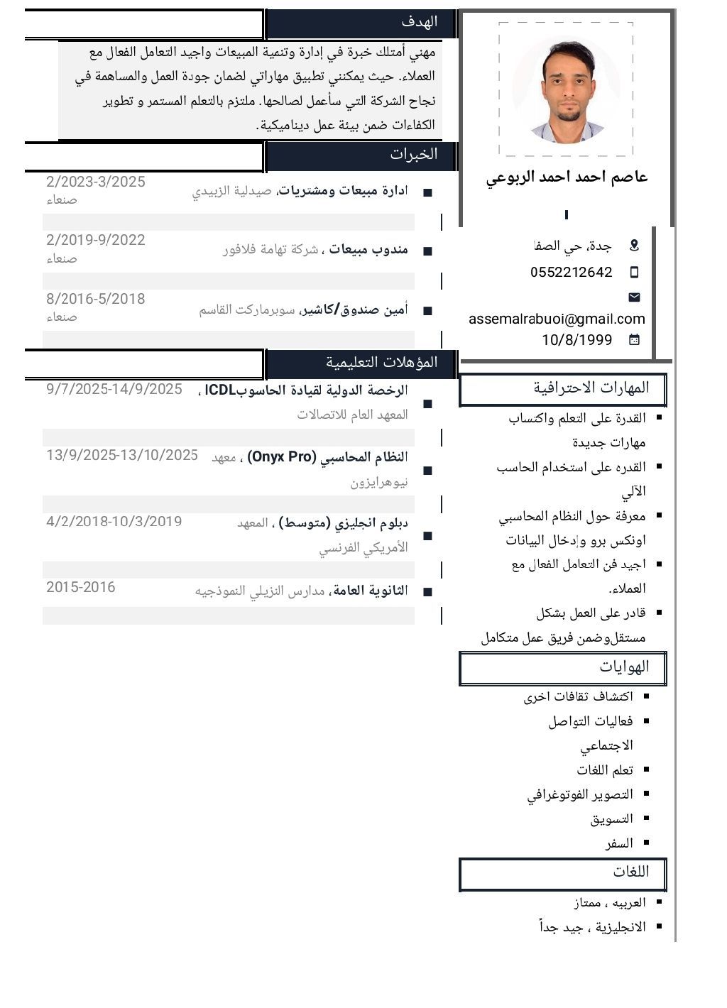 مهني امتلك خبرة في إدارة وتنمية المبيعات وأجيد التعامل الفعال مع العملاء. حيث يمكنني تطبيق مهاراتي لضمان جودة العمل والمساهمة في نجاح الشركة التي سأعمل لصالحها ملتزم بالتعلم المستمر وتطوير الكفاءات ضمن بيئة عمل ديناميكية