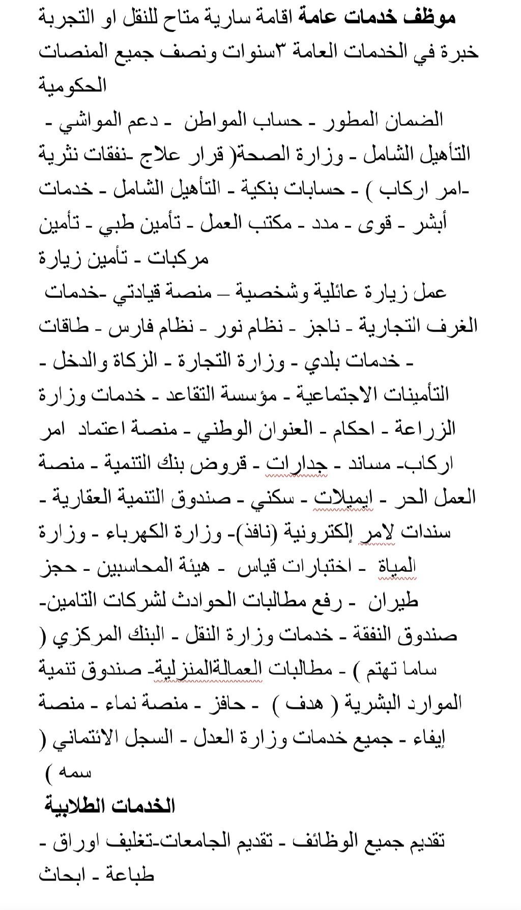 موظف خدمات عامة إقامة سارية متاح للنقل خبرة في الخدمات العامة جميع المنصات الحكومية الضمان المطور - حساب المواطن - دعم المواشي - التأهيل الشامل - وزارة الصحة (قرار علاج - نفقات نثرية - أمر أركاب) حسابات بنكية - التأهيل الشامل - خدمات ابشر - قوى - مدد - مكتب العمل - تأمين طبي - تأمين مركبات - تأمين زيارة عمل زيارة عائلية وشخصية - خدمات الغرف التجارية - ناجز - نظام نور