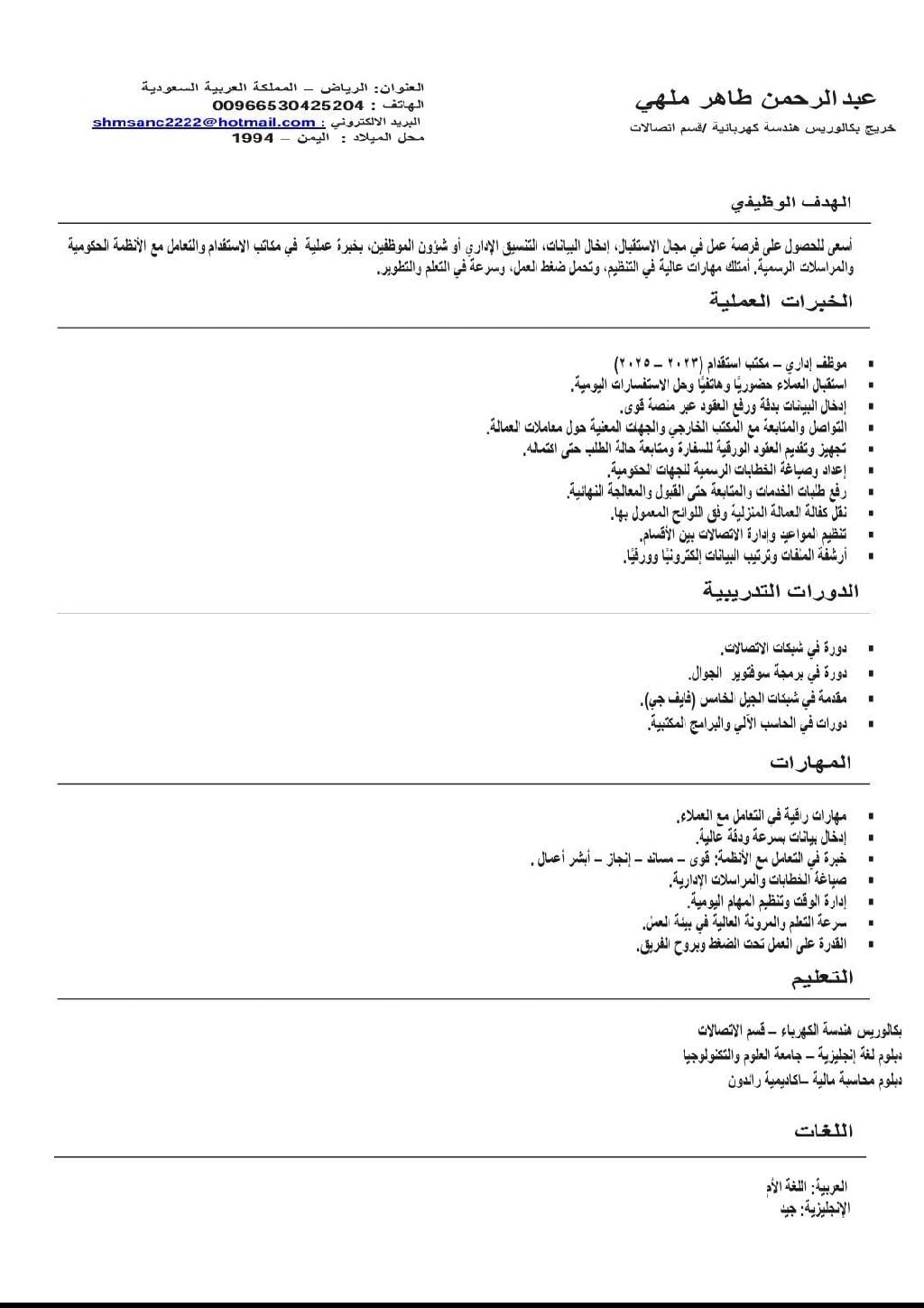 ابحث عن فرصة عمل مناسبة في مجال اداري أو مكتبي، حيث أحمل درجة البكالوريوس في هندسة الاتصالات، بالاضافة الى دبلوم في المحاسبة واللغة الانجليزية. لدي خبرة عملية تتجاوز السنتين في الاستقدام، وأتمتع بمهارات متقدمة في الحاسب الآلي، وإدارة الوقت، والعمل بروح الفريق، والتواصل الفعال. أطمح للانضمام الى جهة رائدة تقدر الطموح وتوفر بيئة مهنية محفزة تتيح التطوير والنمو المستمر. مقر الإقامة الرياض