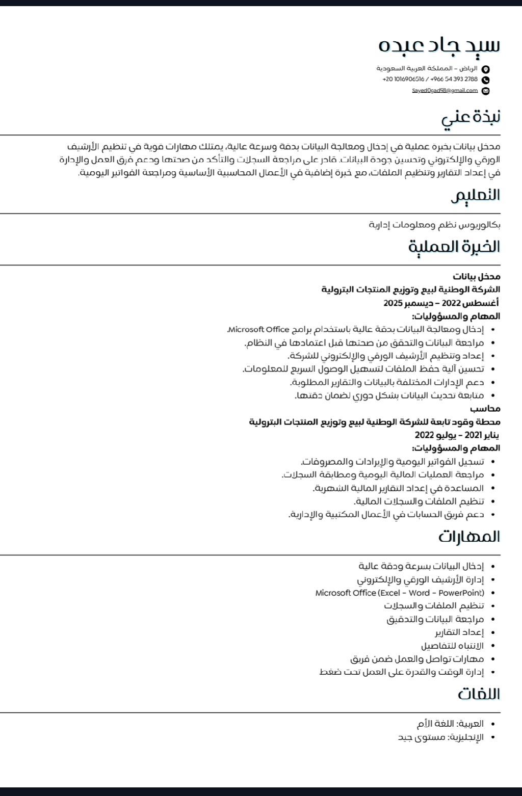 مدخل بيانات بخبرة عملية في ادخال ومعالجة البيانات بدقة عالية، وتنظيم الأرشيف الورقي والالكتروني، مع قدرة على مراجعة السجلات واعداد التقارير ودعم فرق العمل، اجادة استخدام أنظمة التشغيل Windows وبرامج Microsoft Office (Excel - Word) تثبيت أنظمة التشغيل والبرامج الأساسية. تعريف واعداد الطابعات. حل الأعطال التقنية البسيطة المتعلقة بالحاسوب والطابعات لدعم سير العمل