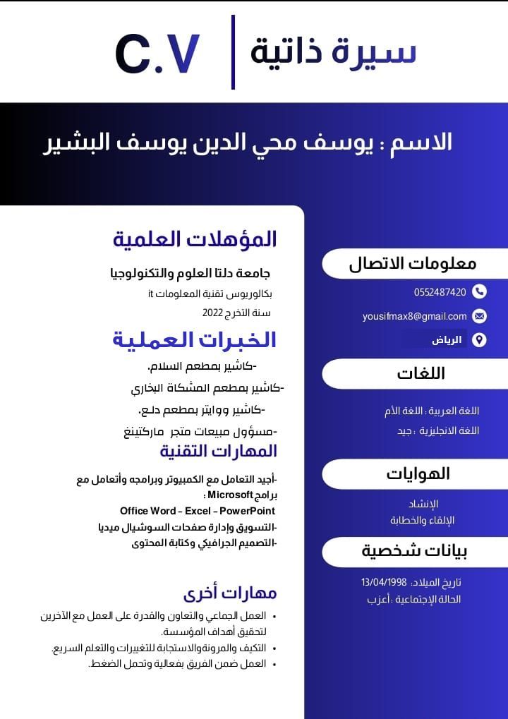 الاسم يوسف محي الدين يوسف سوداني الجنسية - مقيم في الرياض بكالوريوس تقنية المعلومات ابحث عن عمل ولدي خبرة كاشير أو مدخل بيانات أو بائع في متجر أو مشرف عمال إقامة سارية - جاهز للعمل