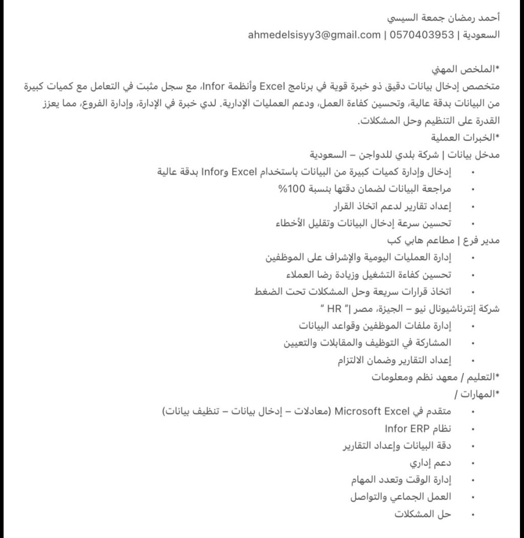 ابحث عن وظيفة مدخل بيانات ويفضل يكون الشغل في شركة لدي خبرة في برنامج الانفور وبرنامج الأكسيل التواصل واتساب على الرقم المرفق