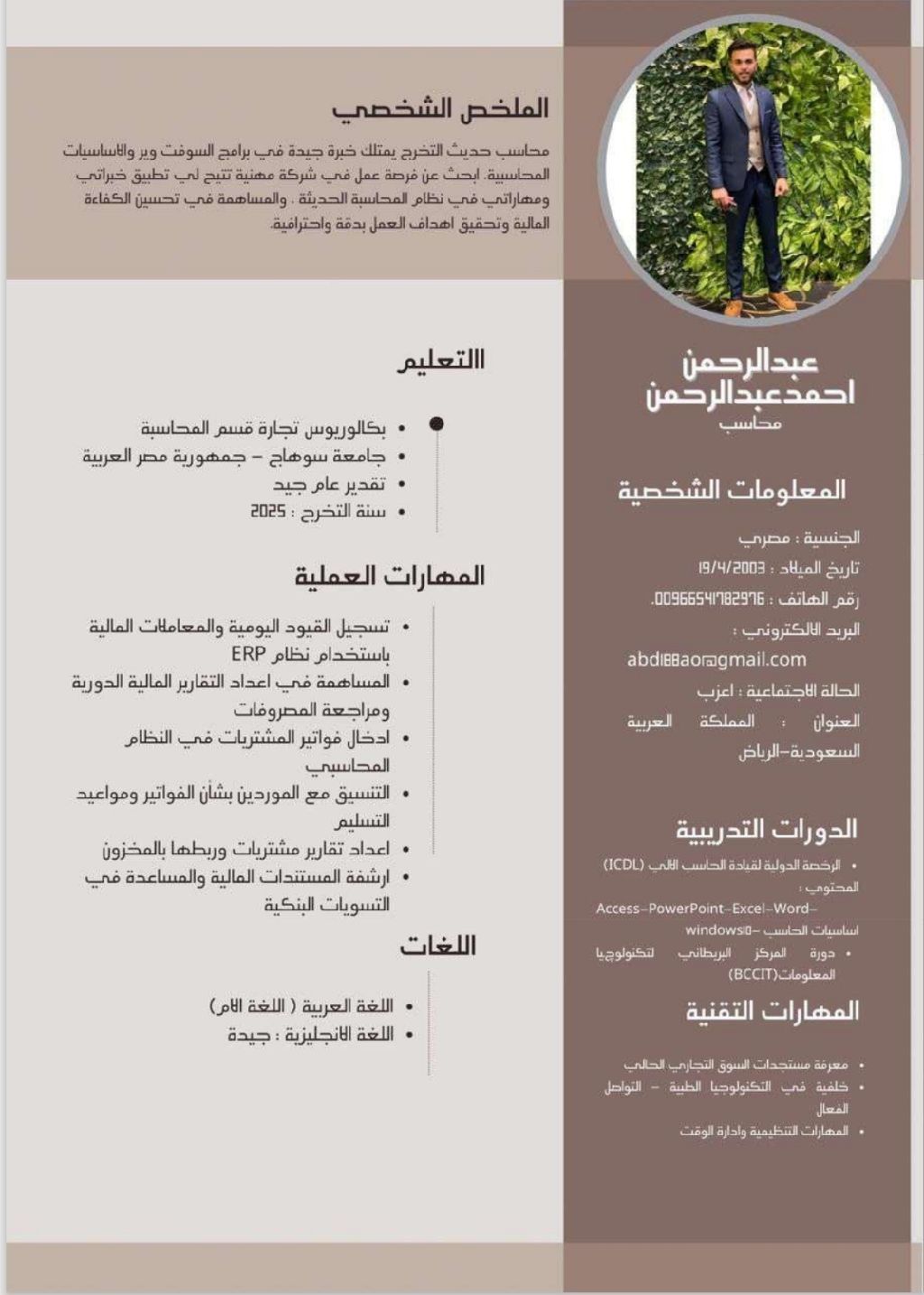 مصري الجنسية حاصل علي بكالوريوس تجارة حديث التخرج مقيم في الرياض القدرة علي استخدام برامج الكمبيوتر Microsoft office world & excel وبرامج ادخال البيانات القدرة علي العمل تحت ضغط وضمن فريق وتنظيم المهام والوقت إقامة سارية وقابلة للنقل